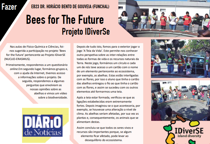 The web-of-life game included in one of the IDiverSE activities (Bees for the Future) seems to be a success among students! Following their experience, 2 students Margarida Nóbrega and Marta Freitas, from Horácio Bento Gouveia School in Madeira wrote an article that was published in the local magazine: “Diário de Notícias”. In their words “we concluded that all living beings and resources are important because if one element is affected, it can lead to the unbalance of the ecosystem”.